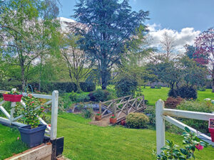 To the front is a drive way and ample parking while to the back is a paved terrace, small pond and a bridge leading to further grounds..