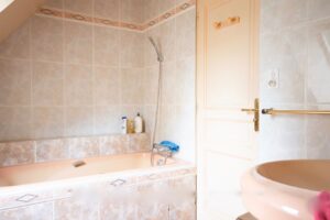The family bathroom includes a bath with shower over, basin, and bidet. The vaulted ceiling here adds an airy and open feel.