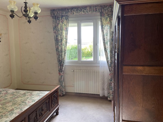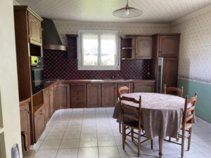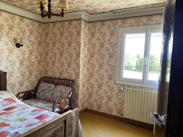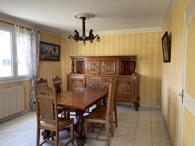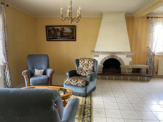 • Charge acquéreurDetached Neo-Breton Pavillon on 4695 m2 of grounds, raised on complete basement (garage, boiler room/laundry room, office) and comprising, on the raised ground floor, beautiful entrance leading to large furnished/equipped kitchen (except LV), dining room and living room with open fireplace, one bedroom, bathroom ( recent) and toilet; First floor with two bedrooms and storage room, bathroom, toilet and attic.