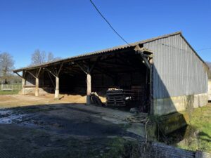En bout de village, sur 1 ha 58 a 32 ca d'un seul tenant, longère de trois bâtiments dont ancienne partie centrale à usage d'habitation d'une pièce avec belle cheminée d'époque ; grenier au-dessus. De chaque côté, dépendances et greniers sur l'ensemble. Bâti avec façade ouverte à usage de garage et four à pains. Deux hangars.