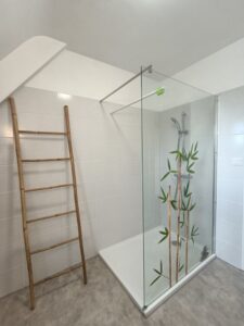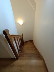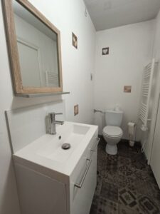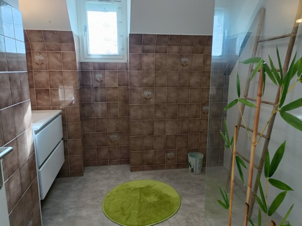 L'autre partie est composée d'une entrée avec placards, une cuisine aménagée et équipée (four, plaques, hotte), une chambre, une salle d'eau et wc (séparé). A l'étage : un dégagement avec placards, 2 chambres, une salle d'eau (douche à l'italienne), WC (séparé) et deux greniers.