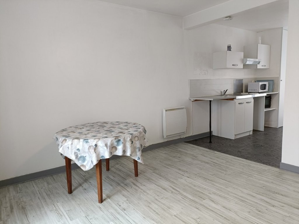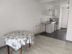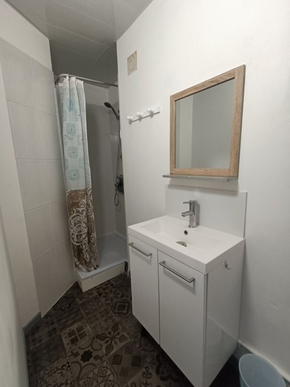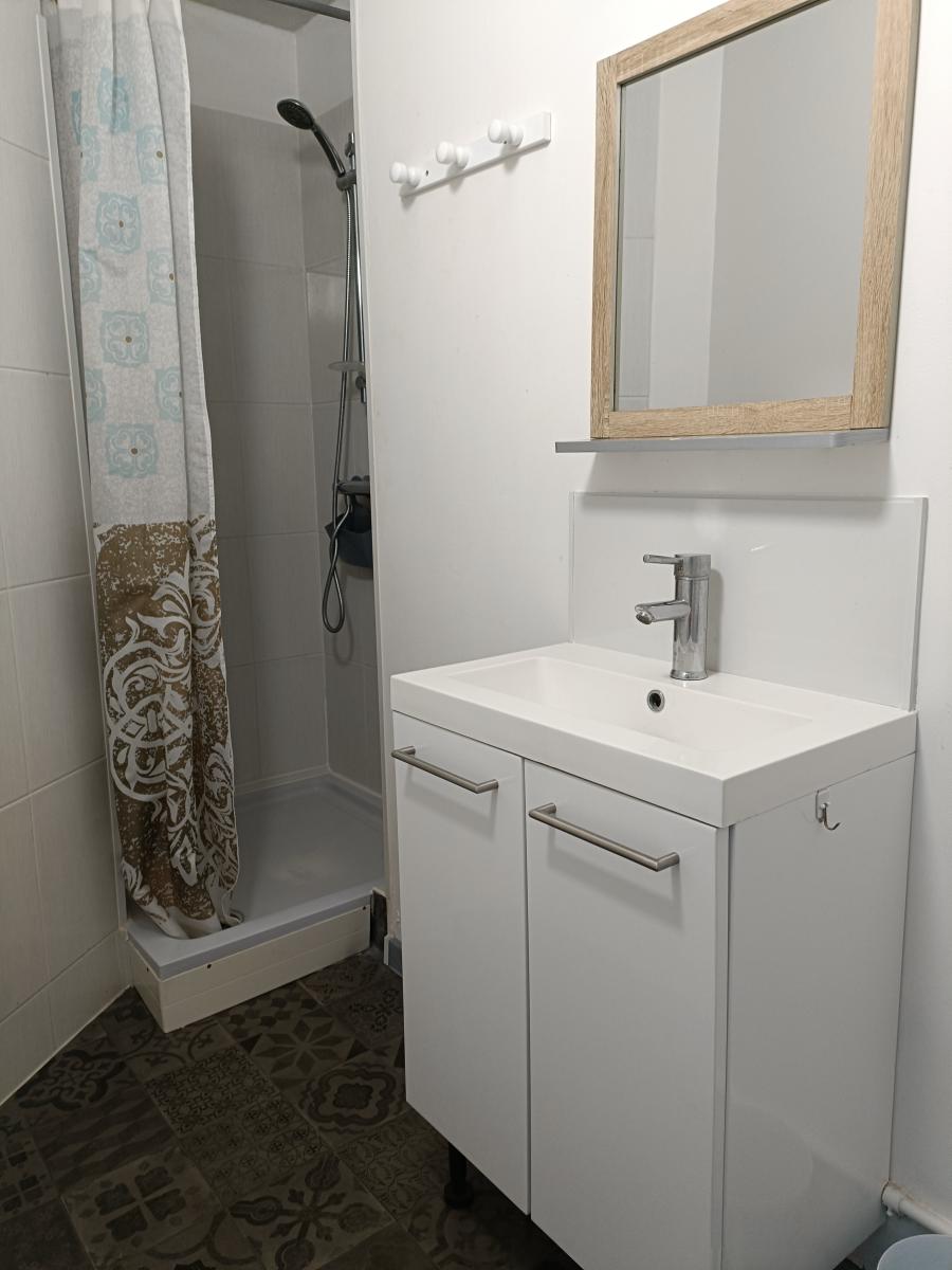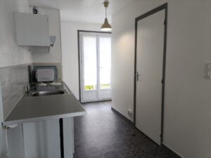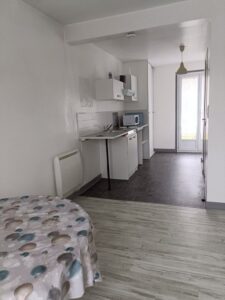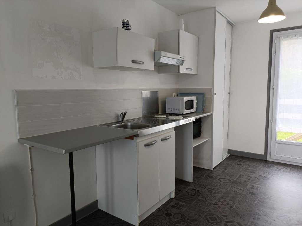Un studio offrant une pièce de vie avec kitchenette, une salle d'eau avec wc et placards de rangement. Une petite terrasse avec accès au jardin.