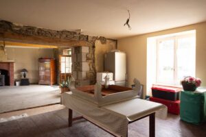 The ground floor of the property has been thoughtfully redesigned ; wide openings between the three main rooms create an enhanced sense of flow throughout the space. There is a bathroom with WC, shower, basin (which, as far as I know, are working) and a washing machine point, so really it could be lived in, or at, whilst merrily creating your own ideal French home this summer. Upstairs are 2 huge rooms which could, I guess, be large enough for 2 or 3 bedrooms and a further shower/bathroom. This house, which many years ago would have been 2 or 3 homes, is totally detached with the majority of its land of 1,323 m2 behind it backing on to fields. There is also a small stone building which, frankly has seen better days, to the front.