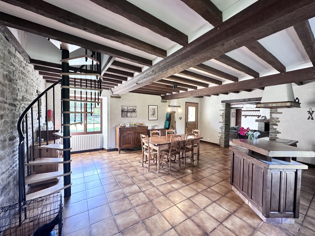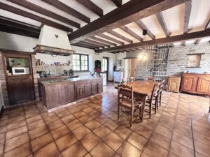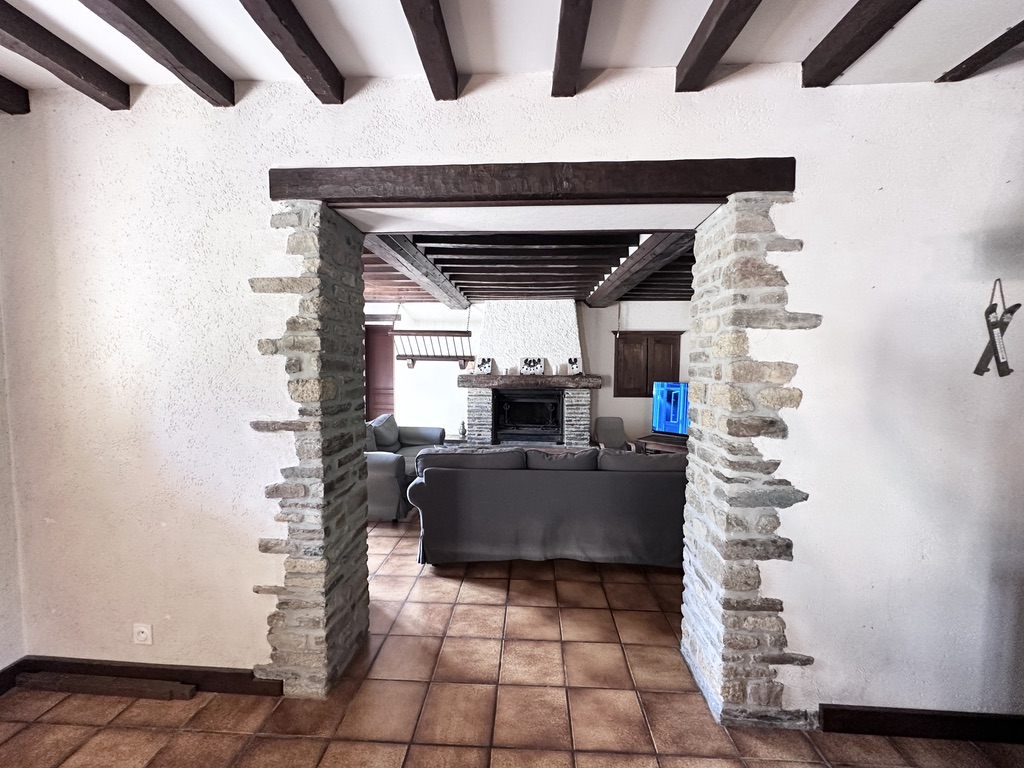 The main house features, on the ground floor, a fitted kitchen with dining area of 38 m², a living room with fireplace of 24 m², a bedroom with built-in wardrobes of 17 m², a bathroom with separate WC and handbasin. Stairs lead to first floor. Upstairs, (accessible also via an external staircase), there is an entrance of 6.3 m² — an ideal feature for a potential B&B activity — a dressing area of 6.8 m², two further bedrooms (12 m² and 34 m²) and a shower room with WC of 2.4 m². An adjoining second part is perfect for family or guests, offering an entrance of 5.8 m², a bedroom of 9.3 m², and a fitted kitchen of 14.5 m², with upstairs a room of 11 m² equipped with a WC (sanibroyeur) and washbasin.