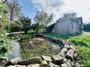 The grounds include a large meadow bordered by hedges, an independent vegetable garden, and a spacious courtyard featuring a well, a pond, and an outbuilding.