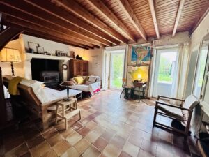 On the ground floor, you’ll find a cozy living room with a fireplace and wood stove, a fully equipped kitchen, a shower room, a laundry room, and an additional room to adapt to your needs—whether as a small lounge, bedroom, or office.