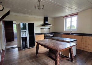 This house, facing south, currently offers approximately 148 m² of living space (excluding veranda) and includes on the ground floor: kitchen (with parquet floors and beams) fitted and equipped with an American refrigerator and a cooking range, shower room - WC, room with wooden floor (under carpet) with fireplace and stove, room with beams and granite fireplace equipped with a stove, opening onto the veranda, bedroom, office.