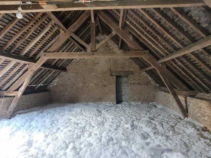 on the ground floor, entrance hall with the original stairs, WC and a cupboard, a kitchen with a fireplace, a small shower room with a sink • 2 through rooms on the ground floor (possible therefore to create a larger room)on the first floor on original wood flooring under the carpet : 2 bedrooms, a bathroom and a large attic space (potentially to convert)