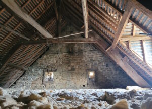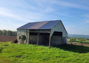 There is a large (former agricultural) outbuilding including a closed space and an attached hangar with an open attic above at 50 m from the house.