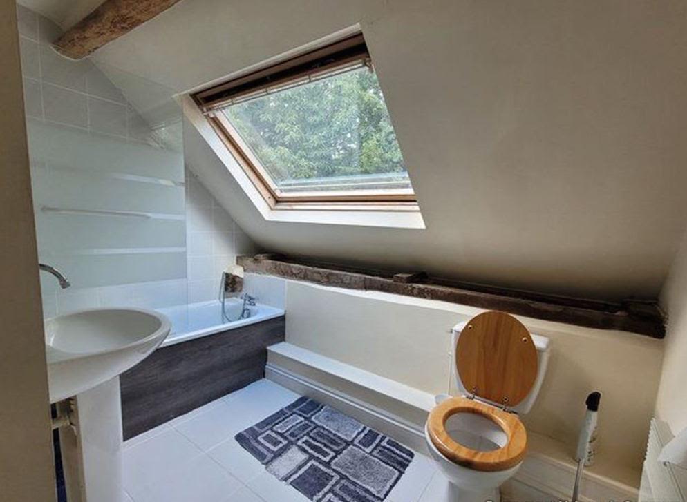 Apartment 1: entrance hall, fitted and equipped kitchen, living room with fireplace (wood stove), toilet. Upstairs: 2 bedrooms, office (or small bedroom), shower room with toilet.