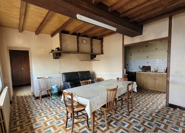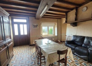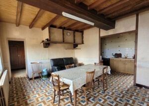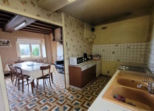 cuisine-séjour avec poutres et cheminée, chambre, salle de bain, WC, cellier.