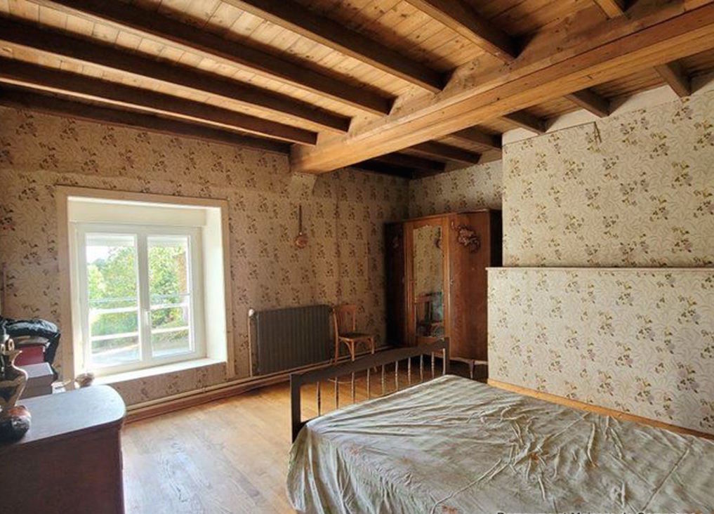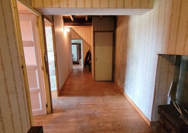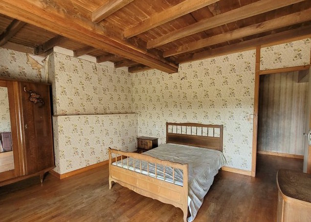 The agent adds... " It is located in a dead end lane with only one other house. The first neighbour's house is at 30 meters distance • Its outbuilding at 15 m from the house opposite the access lane • It is in a hilly area with tracks and hedges • Beyond the big hangar there is an orchard, behind the old house the land is steeper. The bread oven is behind the old house • The house is connected to mains water and a spring • The roof is new on the front and older at the back. Needs to be checked regularly at the back• The electricity is old but works • A new septic system is needed.
