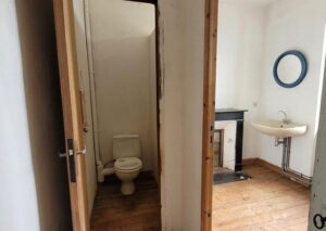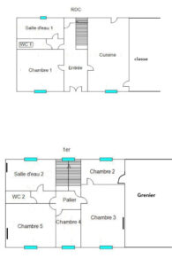 salle d'eau, WC. Deux anciennes classes  à restaurer dont une de près de 60 m² avec belles hauteurs sous plafonds.