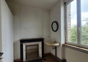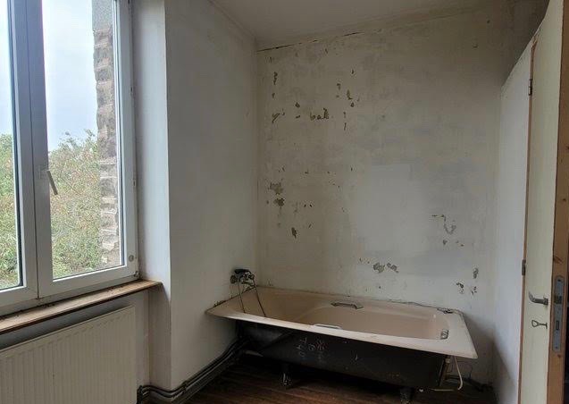 Maison lumineuse à rénover comprenant au rez de chaussée : entrée avec escalier, cuisine avec accès au jardin, chambre sur parquet,