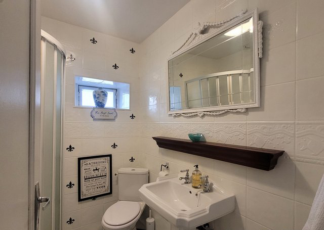 Upstairs: landing-corridor serving 4 bedrooms, one with shower-WC, one with bathroom-WC, one with sink-WC, another bedroom, separate bathroom-WC.