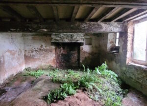 Elle comprend une pièce sur terre battue avec cheminée et poutres.