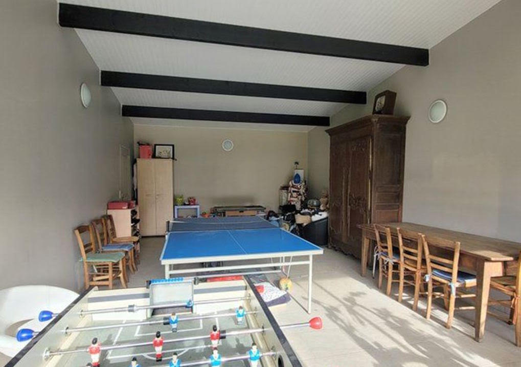 A la suite, remise, garage avec grenier, salle de jeux et piscine chauffée avec grande plage, cabine, WC et douche.